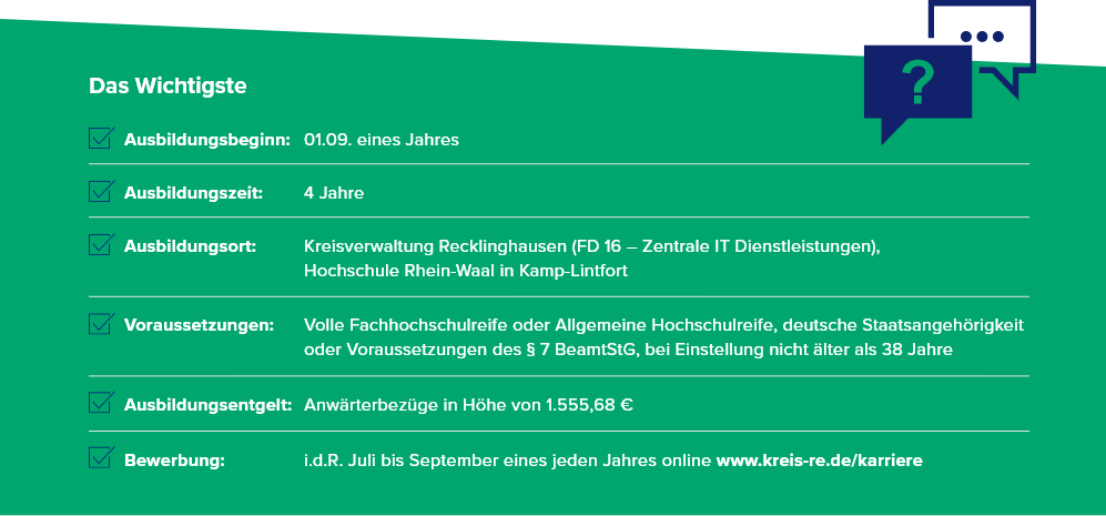 Als Verwaltungsinformatiker*in bist du das Bindeglied zwischen Verwaltung und IT – Digitalisierung ist dein Fachgebiet! Damit du später im Beruf in Verwaltungs- und IT-Fragen mitreden kannst, verbringst du das duale Studium zur Hälfte der Zeit an der Hochschule für Polizei und öffentliche Verwaltung NRW in Münster. Die andere Hälfte bist du im Praxiseinsatz in der Kreisverwaltung Recklinghausen. In den Studienabschnitten lernst du viel über Grundlagen der IT, Anwendungsentwicklung und IT-Management, aber auch Rechts- und Wirtschaftsfächer werden dich begleiten. In den Praxisabschnitten kannst du das Gelernte in verschiedenen Fachdiensten der Kreisverwaltung verknüpfen und anwenden.Mit Beginn des dualen Studiums wirst du bei uns zum/zur Beamten*in auf Widerruf ernannt. Nach der bestandenen Ausbildung ist dir in der Regel eine Übernahme sicher.