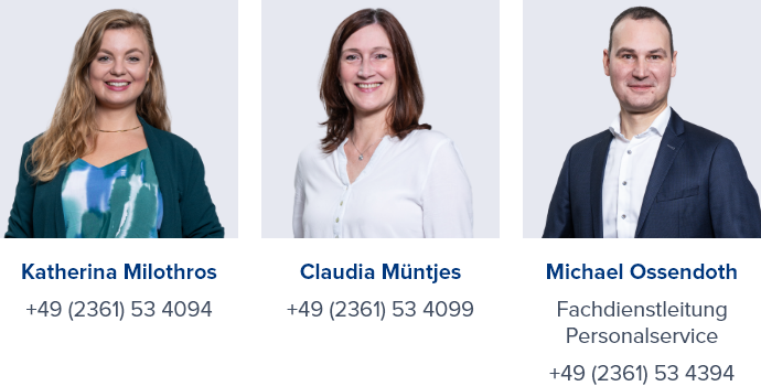 Für allgemeine Fragen rund um Karriereoptionen bei der Kreisverwaltung Recklinghausen steht Ihnen das Team des Fachdienst 11 Personalservice sehr gerne zur Verfügung. E-Mails beantworten wir unter karriere@kreis-re.de.